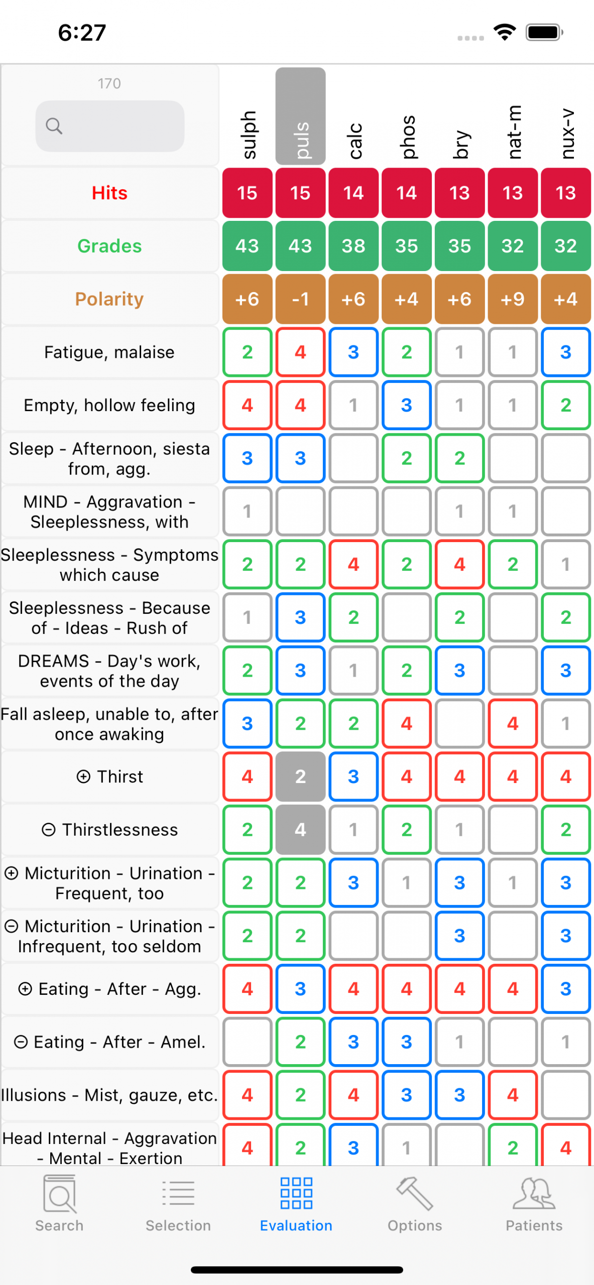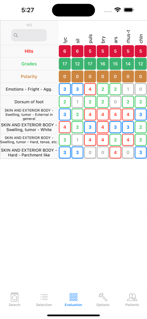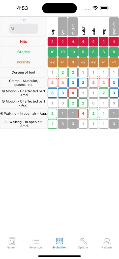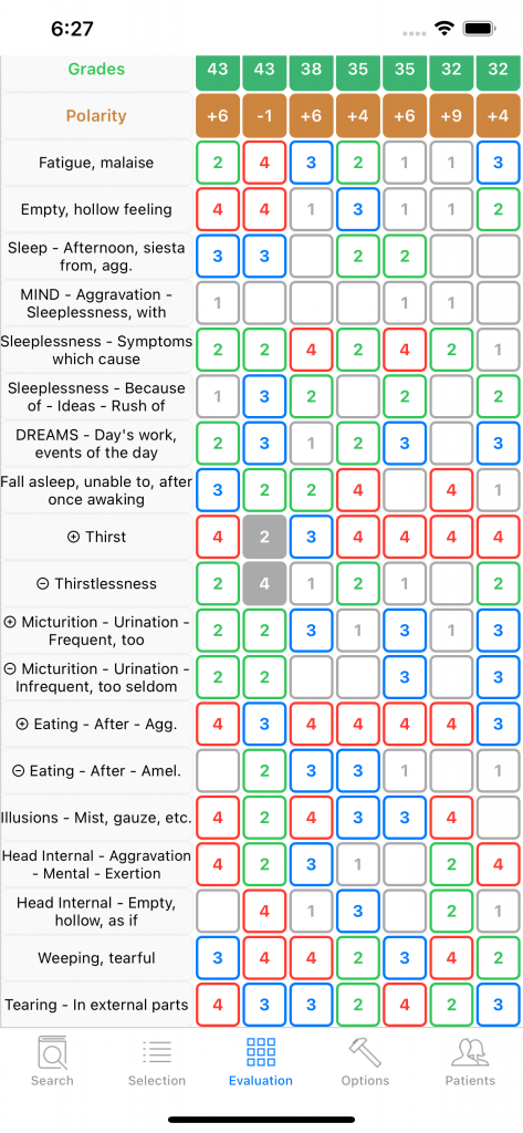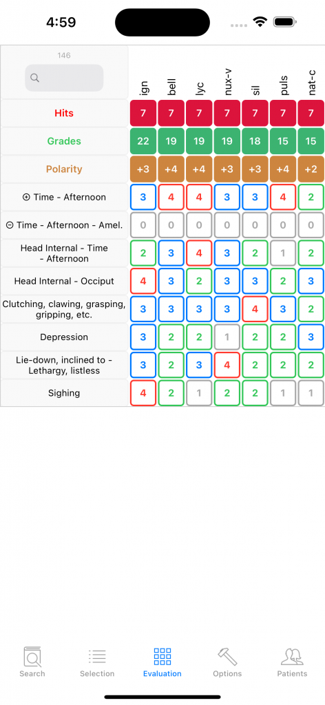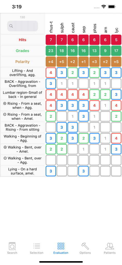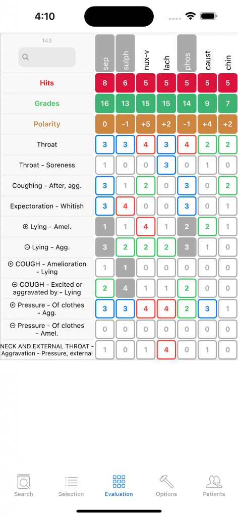 Sepia comes in first but is contraindicated (shaded background) in the grid above. It can nevertheless be the right remedy since it appears in the local COUGH rubric. The general rubric Aggravation while lying has a grade 3, meaning Sepia appears in many symptoms aggravated while lying, its counter-rubric Amelioration while lying has grade 1 but not 0, important difference meaning there exist one, perhaps a few symptoms of Sepia ameliorated while lying. One has to look up in the Materia Medica to decide.