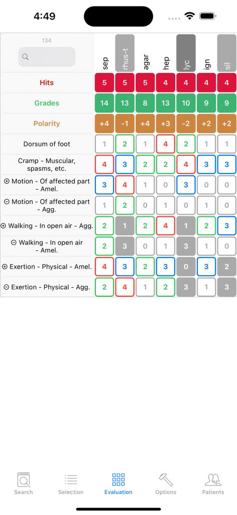 Sepia comes in first by a narrow margin. I later learn that the pain is improved especially when climbing stairs. It confirms the choice of Sepia, which clearly stands out in the chart below. Rhus toxicodendron is contraindicated, Lycopodium is doubly contraindicated.